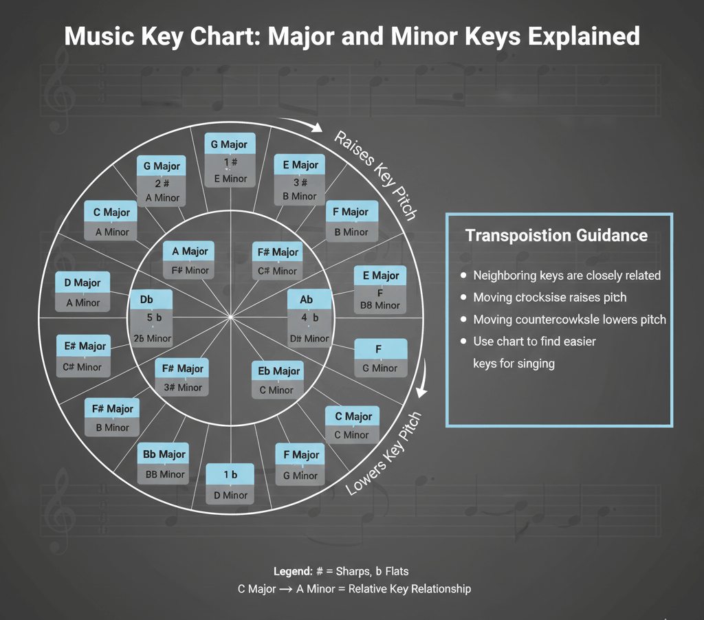 A music key chart helps you find nearby keys that preserve the song but fit your voice.